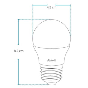 - Marca: Avant; - Referência: 285180350; - Corpo e difusor em policarbonato; - Potência: 4W; - Temperatura da Cor: 4000K; - Fluxo luminoso: 350 lm; - Eficiência luminosa: 88 lm/W; - Tensão: Bivolt; - Base: E27; - Índice de Proteção: IP20; - IRC: >70; - Fator de potência: >0,50; - Possui driver interno isolado; - Baixo consumo de energia; - Temperatura ambiente: -5C a 40C; - Não dimerizável; - Ângulo de abertura: 200; - Uso interno; - Vida útil: 25 mil horas; - Garantia: 1 ano.