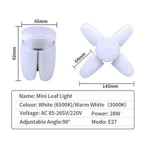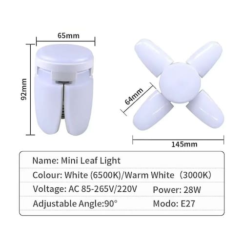 • Design dobrável:A lâmpada LED em forma de leque pode ser dobrada, facilitando o armazenamento e o transporte. • Fluxo luminoso alto:Com um fluxo luminoso de 500-999 lúmens, a lâmpada LED fornece iluminação brilhante e eficiente para qualquer sala. • Ampla Faixa De Temperatura De Cor:A lâmpada LED permite uma variedade de opções de iluminação para se adequar a qualquer humor ou ocasião. • Tipo do bulbo do guarda-chuva:A lâmpada LED é projetada como uma lâmpada de guarda-chuva, proporcionando uma distribuição de luz mais ampla e uniforme em comparação com as lâmpadas tradicionais. Especificação: Modelo: Mini lâmpada dobrável Tipo base: E27 Potência: 28W Temperatura de cor: Branco QUENTE 2700-3500K Tensão: AC 85-265V Ângulo do feixe: 360 ° Vida ÚTIL:> 50.000 horas