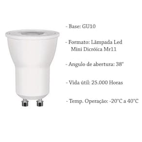 Nós da acende a luz procuramos trazer o que há de mais atual e moderno no mundo da iluminação priorizando sempre a qualidade. Procuramos não apenas atender às suas necessidades, mas superar expectativas. Assim estabelecendo uma relação de confiançaNossa missão é garantir a satisfação total dos nossos clientes.Lâmpada led mini dicroica mr11 gu10 3w 6000k branco frio- base: gu10- formato: mr11- temperatura de cor: 6000k branco frio- tensão: bivolt- potência: 3w- fator de potência: 0.40- fluxo luminoso: 230 lm- eficiência luminosa: 76,7 lm/w- ângulo de abertura: 38- vida útil : 25.000 horas- temp. De operação: -20c 40c- frequência: 50/60hz