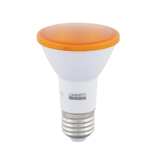 Lâmpada Par38 Led 15W Bivolt Luz Ambar, IP65 E27 Luminatti. Seu acabamento refletor enfatiza o brilho da luz, o distribuindo de forma suave e uniforme. Ideais tanto para ambientes internos como externos, já que as lâmpadas estão protegidas de jatos de água e poeira, com Índice de Proteção 65 (IP 65).