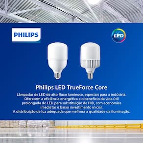 Lâmpada Led Philips alta potência bulbo luz branca fria bivolt base E40 (escolher potência no momento da compra)Garantia: 3 anosCaracterísticas da lâmpada:- Formato - T Shape- Base/encaixe - E27- Não dimerizável- Voltagem - Bivolt 100 - 240 V- Potência em watts - 80WCaracterísticas da luz:- Emissão de luz - 9.000 lumens- Índice de reprodução de cor (CRI) - 80- Vida útil: 25.000 horasAs lâmpadas de LED TrueForce Core I&R da Philips são uma solução de LED fácil com rápido retorno financeiro para substituição de lâmpadas de descarga de alta intensidade (HID). Elas oferecem a eficiência energética e os benefícios de vida útil prolongada do LED para substituição de HID, com economias imediatas e baixo investimento inicial. Com um tamanho de lâmpada correto e uma distribuição de luz adequada, você pode atualizá-las facilmente, ignorando o balastro que já existe, e melhorar a qualidade da iluminação.BenefíciosRedução de custos com rápido retorno financeiroLuz no espaço de trabalho mais amploBaixo investimento inicialLuz com mais qualidade e fácil de instalarCaracterísticasEficiência energética elevadaVida útil de 15.000 horasÂngulo de feixe aberto de 240Ignore o balastro e economize mais energiaLuz branca agradável com CRI 80AplicaçõesIndustrial e de varejo: depósitos, fábricas, lojas, conexões de transporte