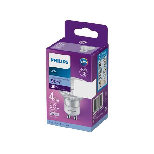Lâmpada Led Philips dicróica bivolt base GU10 (escolher potência e cor da luz no momento da compra)POTÊNCIA: 4,8WFLUXO LUMINOSO: 525LmTENSÃO: BIVOLT 100V-240VBASE: GU10GRAUS: 36GDIMERIZÁVEL: NãoIRC: 80VIDA ÚTIL: 25.000 HorasUso INTERNOPeso: 0,044kg Garantia: 5 anos- Dimensões da lâmpadaAltura 5,4 cmLargura 5 cm A Essential LEDspots, compatíveis com a maioria das instalações existentes com a base GU10, foram desenvolvidas para substituição dos refletores halógenos. Eles permitem uma economia significativa de energia e minimizam o investimento inicial.BenefíciosAté 90% de economia de energia em comparação com lâmpadas halógenas tradicionaisCustos de manutenção menoresBaixo investimento inicialCaracterísticasFácil retrofitVida útil de até 15.000 horasNão dimerizávelIluminação sem ultravioleta e infravermelhoAplicaçõesAplicações residenciais