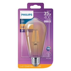 Lâmpada Led Philips Filamento luz amarela 2500K bivolt base E27 (escolher tipo de bulbo no momento da compra)Garantia: 5 anosCaracterísticas da lâmpada:- Formato - Pêra (ST64)- Base/encaixe - E27- Não dimerizável- Voltagem - Bivolt 100 - 240 V- Potência em watts - 4W- Equivalente em Watts - 35WCaracterísticas da luz:- Emissão de luz - 400 lumens- Índice de reprodução de cor (CRI) - 80- Vida útil: 15.000 horas Opte pelo clássico, vintage ou moderno Prefere um design clássico, vintage ou algo mais moderno? Os LED decorativos da Philips estão disponíveis em todas as suas formas e tamanhos favoritos. Os nossos LED decorativos dão um visual especial a cada divisão. Para ver o aspeto das lâmpadas ligadas e desligadas, clique no circulo e arraste-o para a esquerda ou para a direita. Ean: 8719514336179