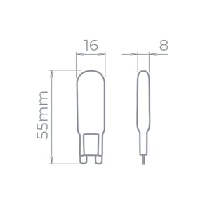 Frequência: 50/60 HzDimensões AxLxP (mm): 55x16x8Garantia: 2 anos junto ao fabricanteFator de Potência: >0,7IRC (Índice de Reprodução de Cor): >80Potência: 4WSoquete: G9Vida Útil: 15.000 horasModelo/Tecnologia: LEDTipo: BipinoDimerizável: NãoÂngulo de Abertura: 300°