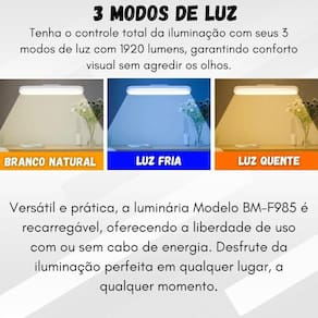 ------------------ Especificações ------------------ Modelo: bm-f985 Quantidade de leds: 28 14 branco frio e 14 branco quente . Controle: botão on/off para alternar entre as 3 tonalidades e ajustar a luminosidade. Instalação: base magnética com tira dupla face para fácil fixação. Fonte de alimentação: recarregável via usb. Ajuste de 90º 3 modo de luz