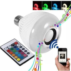 Lâmpada com função caixa de som bluetooth e controle que muda suas cores.