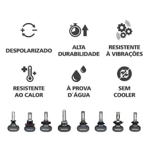 Descrição par lâmpadas ultra led h3 6000k 10000lm efeito xênon aplicação farol carro com reator:Toda a qualidade e excelência do ultra led à sua disposição neste par de lâmpadas no encaixe h3, e mais ainda, pois este modelo conta com led chip de última geração e moderna tecnologia de dissipação de calor que dispensa o uso de cooler.Própria para carros que operam com 9/32v bivolt este par lâmpada ultra led possui temperatura de cor de 6000k, que são nada mais nada menos do que 10000 lúmens no par. Assim a luz emitida fica na faixa de tonalidade branca, fornecendo uma iluminação mais eficiente e bonita.Com acabamento galvanizado e corpo em liga de alumínio, você pode instalar e ficar despreocupado, pois o ultra led é resistente ao calor, vibrações e até mesmo à umidade, graças ao seu alto nível de impermeabilidade.Especificação técnica:- encaixe h3- temperatura de cor: 6000k- eficiência de 10000 lúmens no par- tonalidade branca- potência: 25w cada - voltagem: 9/32v bivolt- quantidade de 2 leds por lâmpada- sem cooler- maior vida útil- acabamento galvanizado e cromado- corpo de liga de alumínio- led chip de última geração- dissipador de calor em alumínio de aviação- sem drive externo, basta plugar- dura até 8x mais- despolarizado- resistente a vibrações- resistente ao calor- proporciona melhora na visualização de placas e sinalizações- nano design à prova dágua- nível de impermeabilidade ip65- reator embutidoConteúdo da embalagem:- 02 lâmpadas ultra led com reator embutidoAtenção: de acordo com a lei federal nº 11.291, a exposição prolongada a ruídos superiores a 85 db pode causar danos ao sistema auditivo.Importante:Garantia de 1 ano.Recomendamos que a instalação seja feita por profissional especializado e não se responsabiliza pelo mau uso do produto.