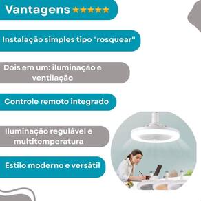 Ventilador de teto led e27 36w, luz ajustável para todo tipo de ambiente Descrição do anúncio: O ventilador de teto com led e controle remoto branco 37w é uma combinação perfeita de funcionalidade e elegância para o seu ambiente. Construído em abs durável, possui um design compacto de 23cm x 23cm, adaptando-se perfeitamente a qualquer ambiente. Compatível com voltagens de 110v e 220v, este ventilador de teto com perfil baixo se encaixa perfeitamente em qualquer espaço, da cozinha à sala de jantar. Equipado com um motor de cobre embutido, garante uma ventilação silenciosa e eficaz. A iluminação é personalizável, com opções de luz quente ou luz natural, controláveis via controle remoto ou de parede. Aprimore seu espaço com nosso ventilador de teto com led e controle remoto branco. Conteúdo da embalagem: 1 luminária led ajustável ventilador de teto 1 controle remoto com bateria 1 manual de instruções Caraterísticas: Pontência: 30 w ventilador: 4w voltagem: 110/220v Níveis de luz: 3 tipos luz branca fria, luz quente, luz natural Dimmável: sim Tipo de base: e27 Material do corpo: abs fácil instalação Multifuncional: design 2 em 1, não é apenas uma luz led mas também atua como ventilador Especificações: Marca: al Tipo de : controle remoto Fonte de alimentação: ac corrente alternada Número de luzes:1 unidade Fonte de luz: lâmpadas led Tamanho: 250mm de diâmetro, 110mm de altura Tensão: 86-265v Vida útil da luz:50.000horas Principais pergutas sobre o produto e respostas: O ventilador de teto é silencioso Sim, ele é equipado com um motor de cobre embutido que garante uma ventilação silenciosa e eficaz. A instalação é fácil Sim, a instalação é rápida e eficiente. Basta parafusar em qualquer suporte de lâmpada e27, sem necessidade de fiação adicional ou eletricista . Quais são as opções de iluminação A luminária led oferece três tipos de iluminação ajustáveis: luz branca fria, luz quente e luz natural. Qual é a voltagem do ventilador O ventilador é compatível com voltagens de 110v e 220v. O controle remoto está incluído Sim, o controle remoto está incluído na embalagem. Marca: Não Informado
