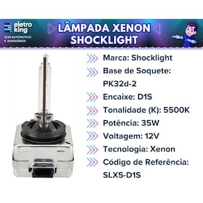 • Marca: Shocklight • Base de Soquete: PK32d-2 • Encaixe: D1S • Tonalidade (K): 5500K • Potência: 35W • Voltagem: 12V • Tecnologia: Xenon • Luz de Alta Intensidade • Proporciona Maior Economia e Qualidade • Dimensões Aproximada do Produto (CxL): 8x5cm • Código de Referência: SLX5-D1S