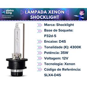 • Marca: Shocklight • Base de Soquete: P32d-5 • Encaixe: D4S • Tonalidade (K): 4300K • Potência: 35W • Voltagem: 12V • Tecnologia: Xenon • Luz de Alta Intensidade • Proporciona Maior Economia e Qualidade • Código de Referência: SLX4-D4S