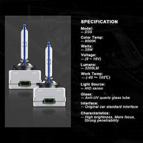 Especificações: Tipo de lâmpada: D3S Tensão de entrada: 12 V Potência de saída: 35 W Temperatura de cor: 8000 K lúmen: até 3200 lm Vida útil: mais de 3.000 horas Classe à prova d'água: IP68 Temperatura de trabalho: -40° C a +105° C Pacote inclui: 2 luzes HID de carro D3S, 1 luva Aplicação: substituição da lâmpada do farol do carro Caixa de lâmpada de fábrica projetada para caber no seu veículo. Características: 1, longa vida útil, alto brilho, ampla faixa de iluminação e baixo consumo de energia. 2, Material do fio: à prova de alta temperatura e à prova de desgaste. 3, Material de vidro: vidro de quartzo, evita que o espelho do carro de fábrica e o abajur se quebrem e atomizem. 4, IP68 à prova d'água: reduz a chance de curto-circuito. 5, Suporte de lâmpada: o suporte de lâmpada de materiais de alta temperatura pode evitar a vaporização e a atomização causadas pela iluminação. 6, Distância focal precisa: a mesma luz da lâmpada padrão pode evitar reflexos. 7, o design Plug and Play, facilita a instalação. Dicas: Use luvas para instalar as lâmpadas HID para evitar impressões digitais no tubo. Nota: Verifique com o tipo de lâmpada padrão, consulte o manual do usuário. - BRILHO: as lâmpadas de reposição HID de xenônio WinPower D3S produzem 3200 lúmens de luz, brilhantes para iluminar a mancha escura no horizonte, bem no centro da estrada, a luz é uniforme e simétrica, uma visão mais clara pode reduzir bastante a taxa de acidentes de trânsito. - LONGA VIDA: As lâmpadas dos faróis D3S HID usam emissão eletrônica de gás de excitação, consomem 35W de eletricidade e reduzem bastante a carga no sistema elétrico do veículo. Dura mais de 3000 horas de vida útil mais de 5 vezes mais do que as lâmpadas padrão. - ALINHAMENTO EXATO: Cada lâmpada D3S HID é alinhada a laser à base durante o processo de fabricação para garantir um padrão de feixe estreito. Com uma mistura de gás xenônio que é medida até a temperatura de cor adequada e não desbota com o tempo. - CONFIABILIDADE: as lâmpadas de xenônio D3S funcionam a 85 volts; quando o sistema de alimentação do veículo e a bateria falham, o reator é desligado automaticamente para parar de funcionar. Um foco de distância aprimorado com um brilho reduzido para uma visão clara da estrada lateral e da estrada descendente. - FÁCIL INSTALAÇÃO: Plug N Play. Projetado para caber no compartimento da lâmpada de fábrica sem a necessidade de fiação ou modificação. Evite tocar nas lâmpadas com os dedos durante a instalação.