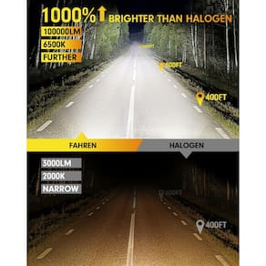 -?1000% mais brilhantes que halogênios?Melhore sua visibilidade ao dirigir com a mais nova combinação de lâmpadas H11 9005! Experimente uma luz 1000% mais brilhante do que as lâmpadas halógenas padrão, graças à avançada tecnologia CSP (Chip-Scale Package) de 16 chips. Essas lâmpadas de alto desempenho produzem uma poderosa saída de 100.000 LM com um feixe branco frio de 6500 K, garantindo uma iluminação mais clara, ampla e de longo alcance para condução noturna, condições de neblina e chuva forte.