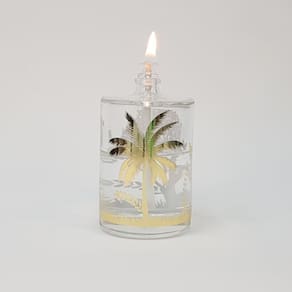 Especificações: 5,5 cm de diâmetro. Material Lamparina: Vidro de aproximadamente uma espessura de 3mm Pintura da floresta em dourado que imita o folhado a ouro Detalhes: Marmorizados imitam o folhado a ouro Pavio: Vidro eterno Sem Cheiro Marca: Velas Bistrot Classificação de risco do óleo não incluso : 1 Não inflamável