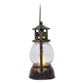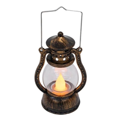 Luminária em forma da lamparina pequena com 12 cm de altura. Interior com enfeite em forma de 1 vela. Botão liga e desliga. Ao ligar, é como se a vela estivesse acesa. Funcionamento: 3 baterias LR44. Material: plástico Dimensões com a alça: 15cm de altura