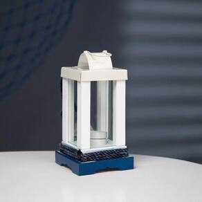 Especificações: Cor: Branco e Azul Medidas: Altura 19cm, Largura 9,5cm Material: Alumínio e Madeira Função: Luminária Modelo: Naval