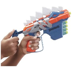 A aventura ganha novas emoções com estes lançadores da equipa de elite DinoSquad! Os mais poderosos dinossauros inspiram o design destes lançadores, trazendo grande ação à aventura! A ação torna-se jurássica com o lança dardos Nerf DinoSquad Stego-smash, que apresenta um impressionante dino design de estegossauro! O lançador é de carga frontal: basta inserir 1 dardo no tubo frontal, preparar e lançar. O porta-dardos para 4 dardos no apoio mantém os dardos ao alcance para recarregar e continuar a brincar.