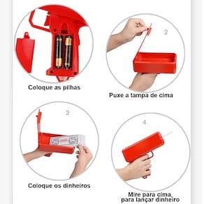 Transforme qualquer festa em palco de surpresa com este divertido e estiloso Lançador.Ele dispara dinheiros falsos ou verdadeiros (vêm inclusas cédulas falsas) para um efeito espetacular em aniversários, casamentos, formaturas, festas temáticas e gravações de vídeo.