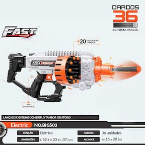 Lançador de Dardos - Fast Pionner Electric - Gatling - Zippy Toys: experimente a diversão de lançamento rápido com Fast Pioneer Electric! Este lançador de dardos de espuma foi projetado para disputas cheias de ação. Com 36 dardos inclusos e um tambor giratório com capacidade para 20 dardos, este lançador oferece emoção sem parar. Os dardos de espuma proporcionam uma experiência segura, tornando-a adequada para crianças a partir de 06 anos. Detalhes: • Lançador soft de dardos elétrico com tambor giratório duplo • Prepare-se para aventuras emocionantes intensas com este lançador elétrico de alto desempenho • Lançador semi-automático: este modelo possui um botão interruptor para ativar o tambor giratório. Quando o interruptor está ativado, basta apertar o botão, para lançar dardos em alta velocidade. • Alta capacidade: tambor de armazenamento com alta capacidade para 20 dardos. Este é um lançador de dardos que pode ser manuseado com uma mão. O design do tambor giratório duplo permite carregar até 20 dardos. • Acompanha 36 dardos de espuma para disputas prolongadas • Dardos macios: produzidos com espuma macia, que garantem uma brincadeira segura sem causar danos ou ferimentos • Recarga fácil e rápida: tambor de recarga rápida durante disputas intensas • Desempenho poderoso: lança dardos a velocidades impressionantes para uma brincadeira emocionante (alcance aproximado: 15 a 20 m) • Alcance ajustável: permite que você controle a distância e a intensidade de cada lançamento • Design ergonômico: pegada confortável e controle fácil de utilizar para maior Informações: • Produto: Lançador Elétrico Infantil Rotativo 20 Lançamentos • Marca: Zippy Toys • Coleção: Fast Pionner Eletric • Tipo: Lançador de Dardos • Categoria: Lançadores Infantis • Tamanho (C x A x L): 52 x 23 x 07 cm • Capacidade de lançamento: 20 dardos • Alcance aproximado de lançamento: 15 a 20 m • Conteúdo: - 01 Lançador de Dardos - 36 Dardos • Recomendação: para crianças a partir de 06 anos de idade Especificações: • Modelo: BIG503 • Referência: 10318 - LD24190 • Código de barras: 7908216133211 • Embalagem (C x A x L): 69 x 35 x 6.5 cm • Embalagem (Peso): 1.257 kg • Material / Composição: - Lançador: Plástico ABS - Dardos: Espuma • Funcionamento: 06 pilhas AA 1.5V • Registro: 0088721/2024 • Certificado: Órgãos Autorizados - OCP´S (Organismos de Certificação de Produtos) Aviso: • As imagens são meramente ilustrativas • Os pesos, tamanhos e medidas são aproximados • As cores e estampas dos produtos podem ter variações • As informações são de responsabilidade do fabricante ou fornecedor