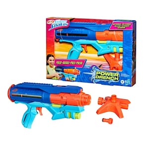 O lançador de água Nerf Super Soaker Power Drench possui excelente performance em batalhas aquáticas com laçamentos de alta pressão! Inclui tecnologia de fácil preenchimento do tanque que adiciona pressão automaticamente. Lançador de alta performance que vai molhar todo mundo nas brincadeiras no quintal. Basta encaixar a mangueira na base de preenchimento e colocar o lançador na base para enchê-lo e inserir pressão. Requer mangueira, não incluída. Vem com adaptador para a mangueira.