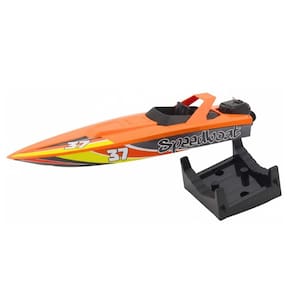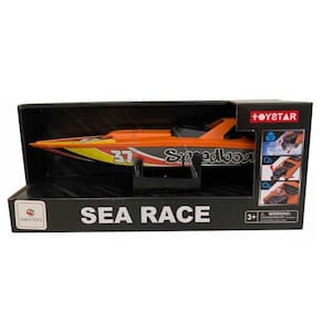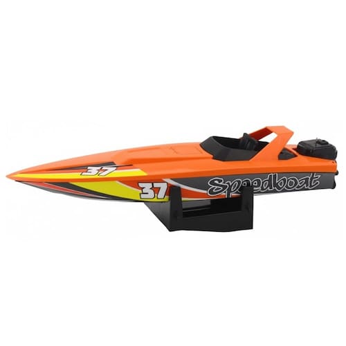 Este é uma Lancha de brinquedo, com um design aerodinâmico e cores vibrantes em laranja, preto e amarelo, destacando o número de corrida 37. E a escrita "Speedboat". Seu design elegante simula uma lancha de corrida real, pronto para cortar a água. Inclui um suporte preto para exposição. É ideal para fãs de veículos aquáticos e brincadeiras de aventura. Escala 1:14
