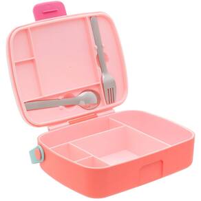 Possui divisórias para separar os alimentos e talheres em aço inoxidável.