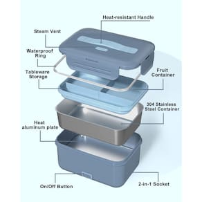 Com uma alça retrátil de borracha, é anti-queimadura e antiderrapante e fácil de transportar. Há um orifício de vapor na capa, com um design de arco circular e um recesso de um lado, que é fácil de abrir à mão. - Design de camada dupla – 2 recipientes empilháveis, o recipiente inferior de aço inoxidável pode conter 1,8 l de comida e a camada superior do recipiente de material PP contém três pequenos compartimentos (1 armazenamento de talheres e 2 compartimentos separados de armazenamento de frutas). O portátil lonchera eléctrica é perfeito para embalar uma variedade de alimentos em porções saudáveis, ajudando você a alcançar uma dieta equilibrada enquanto mantém o sabor autêntico da comida! - Propriedades mais fortes à prova de vazamento – a capa de lancheira elétrica tem travas em todos os quatro lados e sua área de cobertura é projetada para ser maior, tornando-a mais forte e não quebra facilmente. E o anel de vedação de borracha embutido pode garantir que a comida não vaze durante o transporte e mantenha a comida fresca! Não precisa se preocupar com derramamentos de alimentos, mesmo em um ambiente de carro instável! - Desfrute de comida quente e saudável! - Feito de material premium de qualidade alimentar, é o melhor recipiente térmico para embalar alimentos saudáveis. O revestimento externo tem forte resistência ao calor, mesmo que a temperatura interna atinja 100 graus, não estará quente! O aço inoxidável 304 para o tanque interno não tem odor e é durável, reutilizável e fácil de limpar! - Aquecedor de alimentos portátil 4 em 1 – está equipado com 2 adaptadores de energia: um adaptador interno doméstico de 110V/220V, um carro de 12V/24V e um adaptador de caminhão. Conecte a energia para aquecer a comida, pode ser usada em casa/escritório/carro/caminhão. Permite que você desfrute de refeições frescas e quentes, esteja trabalhando ao ar livre ou em ambientes fechados! Também é um presente de elefante branco ideal e emocionante para familiares e amigos! - Máximo de 100 W de alta potência e aquecimento rápido – Lancheiras elétricas para adultos adotam um sistema de aquecimento PTC, com temperatura constante e função de ciclo de baixo consumo de calor, pode manter os alimentos aquecidos uniformemente e também bloquear a umidade dos alimentos. Leva apenas 20 a 30 minutos para aquecer rapidamente até a temperatura ideal, desfrute de uma refeição caseira fresca! Elimine a fadiga do seu dia!