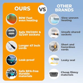 Apresentamos a lancheira elétrica FORABEST - uma solução inovadora projetada para aqueles que valorizam a conveniência e se recusam a comprometer a qualidade de uma refeição caseira. Esta excepcional lonchera térmica para comida caliente atende tanto a profissionais de colarinho azul quanto a trabalhadores de escritório ocupados que buscam uma maneira confiável de desfrutar de refeições quentes e deliciosas a qualquer hora, em qualquer lugar. A lancheira aquecida FORABEST é projetada para atender às diversas necessidades dos estilos de vida modernos. Equipada com várias opções de energia — 12 V, 24 V, 110 V e 220 V — esta lancheira versátil garante uma usabilidade perfeita, esteja você na estrada, no escritório ou até mesmo em casa. Cada caixa vem com generosos cabos de alimentação de 119 cm, acomodando várias configurações e garantindo que sua refeição esteja sempre ao seu alcance. Dentro, você encontrará dois recipientes de aço inoxidável projetados para manter suas refeições frescas e segregadas. Estes recipientes são perfeitos para preservar os sabores de seus pratos favoritos, tornando este aquecedor de almoço a escolha ideal para aqueles que amam variedade em seus almoços. Com a conveniência adicional dos utensílios incluídos, a lancheira aquecida FORABEST para adultos é realmente um pacote completo. Nossa lancheira elétrica para adultos é mais do que apenas uma solução prática para manter sua comida aquecida; também é um excelente presente para homens que apreciam funcionalidade e estilo. Se você está procurando um aquecedor portátil de lancheira ou um presente atencioso para um motorista de caminhão ou trabalhador de construção, esta lancheira térmica para homens certamente impressionará. Abrace a conveniência de um micro-ondas portátil com a lancheira elétrica FORABEST Seu design eficiente garante que suas refeições estejam prontas para comer sempre que houver fome. Os aquecedores elétricos de alimentos são ideais para manter seu almoço quente, tornando-os um companheiro perfeito para longas viagens ou dias úteis exigentes. Escolha a lancheira térmica FORABEST para uma mistura de praticidade, durabilidade e estilo. Experimente o conforto de desfrutar de uma refeição quente sem o incômodo dos métodos tradicionais de reaquecimento. Este produto não é apenas um aquecedor de alimentos; é uma atualização de estilo de vida para aqueles que exigem mais de suas rotinas na hora do almoço. - Refeições caseiras quentes em qualquer lugar – Diga adeus a almoços frios e fast food. Nosso aquecedor de alimentos portátil de 80 W (lancheira aquecida) aquece alimentos em 20 a 30 minutos, perfeito para motoristas, viajantes e profissionais ocupados. Não é necessário micro-ondas portátil. - Dois recipientes de aço inoxidável – fáceis de limpar e podem ser lavados na lava-louças – Esta lancheira térmica para homens e mulheres inclui duas bandejas removíveis de aço inoxidável 304, mantendo arroz, carnes e vegetais separados. A tampa à prova de vazamento evita derramamentos, tornando-a ideal para ensopados em movimento. Pode ser lavado na lava-louças, garantindo uma limpeza sem esforço. - DESIGN MULTIUSO PARA CARRO, CAMINHÃO E ESCRITÓRIO - Nossa lancheira para aquecedor de alimentos é compatível com tomadas de carro e caminhão de 12V/24V e tomadas de 110V/220V para casa ou escritório, garantindo uma refeição quente em qualquer lugar. Uma ótima alternativa a um micro-ondas portátil para carro. Este é o melhor aquecedor de almoço portátil para o trabalho. Um ótimo presente para homens e o presente ideal para mulheres. - Materiais duráveis, à prova de vazamentos e seguros para alimentos – Feita com materiais de alta qualidade e sem BPA, esta lancheira elétrica para homens e mulheres é uma lancheira com autoaquecimento com vedações de borracha seguras e grampos resistentes para evitar derramamentos. Ideal para trabalho, viagens rodoviárias e almoços remotos. - Kit completo de uma marca norte-americana confiável – comprometida com a qualidade e excelente suporte ao cliente. A lancheira quente FORABEST para adultos (lancheira aquecida) inclui uma bolsa de transporte isolada, utensílios, 2 bandejas de aço inoxidável de 3,5 cm, cabos de alimentação de 5 x 119 cm, fornecendo tudo o que é necessário para uma refeição quente e saudável em qualquer lugar.