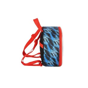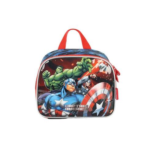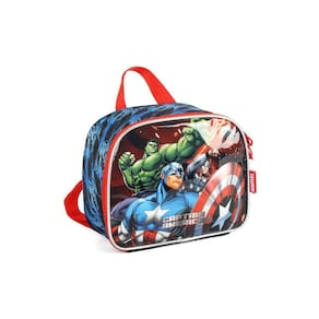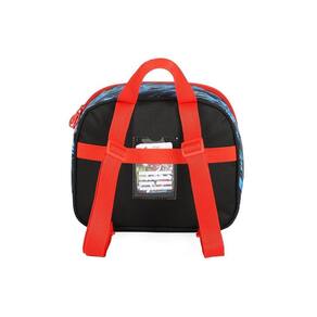 Lancheira térmica com estampa frontal, alça de mão, alça de costas reguláveis, fechamento em zíper e etiquetas personalizadas.