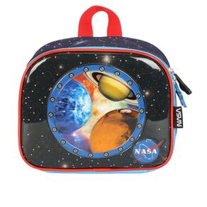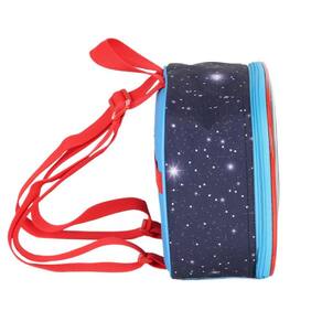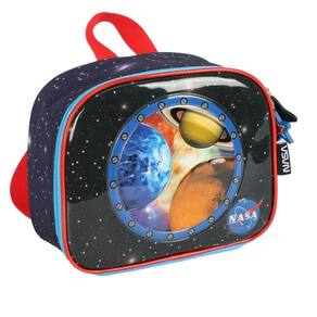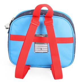 Lancheira térmica com estampa frontal, alça de mão, alça de costas reguláveis, fechamento em zíper e etiquetas personalizadas.