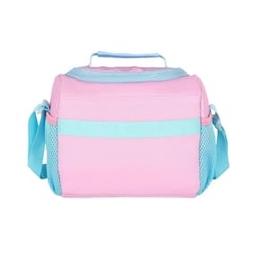 Lancheira térmica com estampa frontal, alça de mão, alça de costas reguláveis, fechamento em zíper e etiquetas personalizadas.