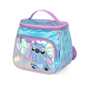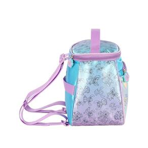 Lancheira térmica com estampa frontal, alça de mão, alça de costas reguláveis, fechamento em zíper e etiquetas personalizadas.