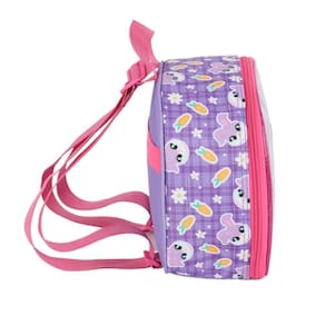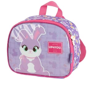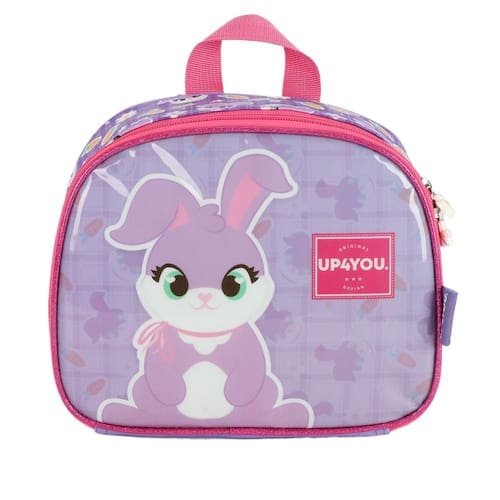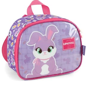 Lancheira térmica com estampa frontal, alça de mão, alça de costas reguláveis, fechamento em zíper e etiquetas personalizadas.