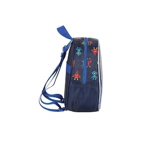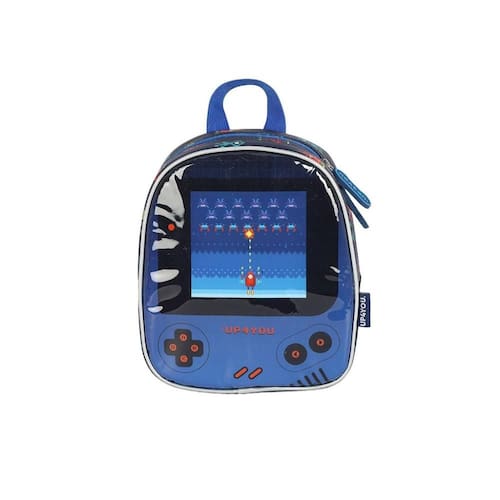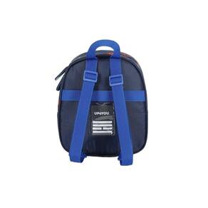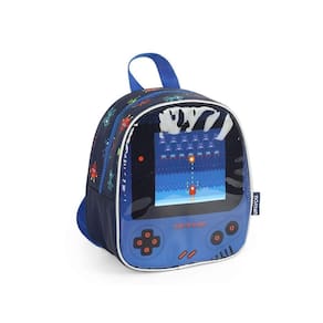 Lancheira térmica com estampa frontal, alça de mão, alça de costas reguláveis, fechamento em zíper e etiquetas personalizadas.