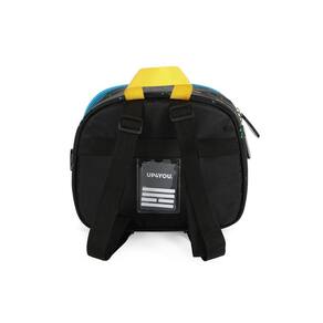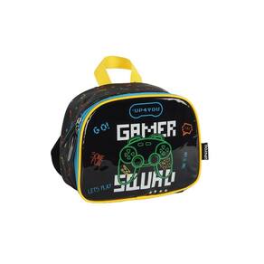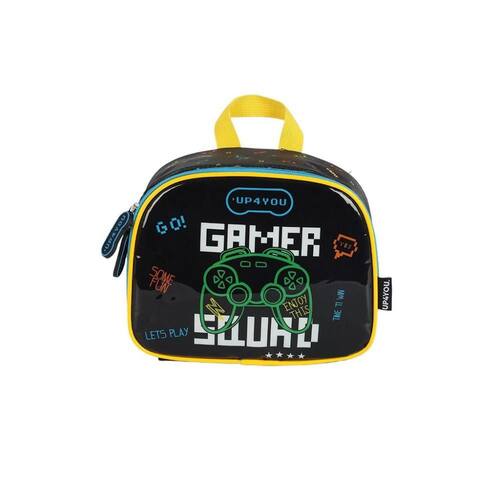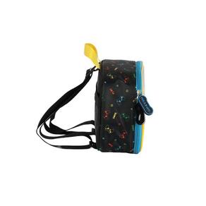 Lancheira térmica com estampa frontal, alça de mão, alça de costas reguláveis, fechamento em zíper e etiquetas personalizadas.