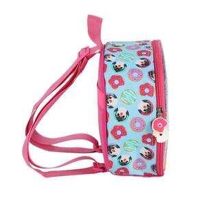 Lancheira térmica com estampa frontal, alça de mão, alça de costas reguláveis, fechamento em zíper e etiquetas personalizadas.