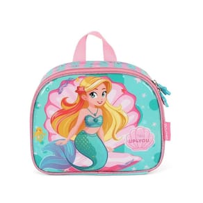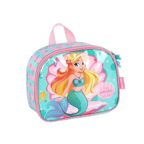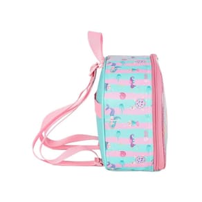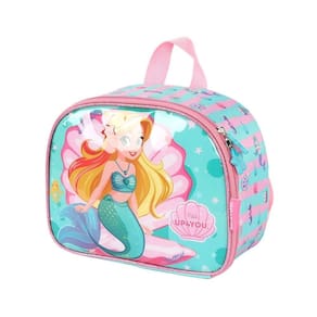 Lancheira térmica com estampa frontal, alça de mão, alça de costas reguláveis, fechamento em zíper e etiquetas personalizadas.