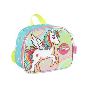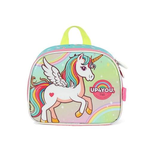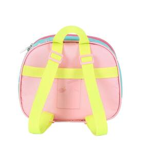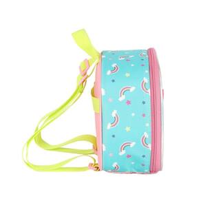 Lancheira térmica com estampa frontal, alça de mão, alça de costas reguláveis, fechamento em zíper e etiquetas personalizadas.