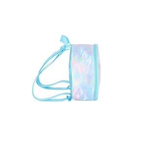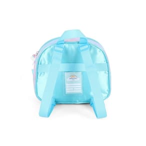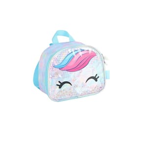 Lancheira térmica com estampa frontal, alça de mão, alça de costas reguláveis, fechamento em zíper e etiquetas personalizadas.