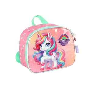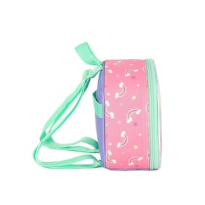 Lancheira térmica com estampa frontal, alça de mão, alça de costas reguláveis, fechamento em zíper e etiquetas personalizadas.