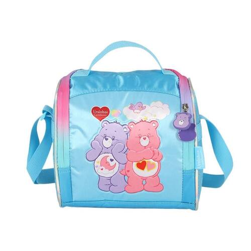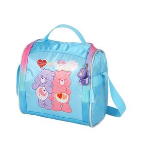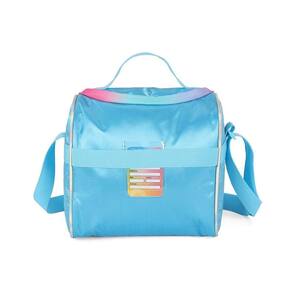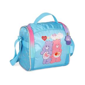 Lancheira térmica com estampa frontal, alça de mão, alça de costas reguláveis, fechamento em zíper e etiquetas personalizadas.