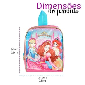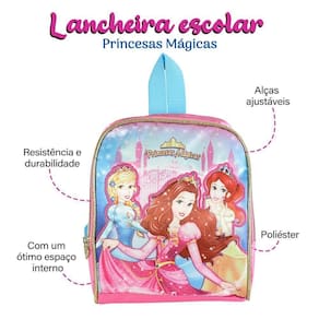 Lancheira Escolar Princesas Mágicas Com um toque encantador, essa lancheira será a companheira perfeita para a hora do lanche na escola!A lancheira conta com uma cor rosa vibrante e estampa das princesas mágicas, além de detalhes dourados para dar ainda mais estilo e magia.Seu design é compacto, podendo ser levada para qualquer lugar que você vá, desde a escola até uma viagem ou passeio. Com um ótimo e espaçoso espaço interno, é perfeita para carregar seu lanche para todos os lugares, além das alças ajustáveis que garantem conforto no transporte .Confeccionada com materiais de alta qualidade, garante que seu lanche ficara seguro, proporcionando resistÇencia e durabilidade para que possa ser usada sem preocupações. *CUIDADOS*-Para a limpeza, utilizar apenas pano úmido e sabão neutro;-Evitar colocar excesso de peso no produto para não forçar os zíperes e costuras; ESPECIFICAÇÕES:Material: PoliésterDimensões: Alt.: 28cm x Larg.: 23cmPeso: Aprox. 180gCores: Rosa com detalhes em dourado CONTÉM:01 LANCHEIRA ESCOLAR PRINCESAS MÁGICAS