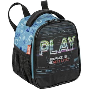 Lancheira Sestini com fechamento em zíper, tag identificador, acompanha potinho e garrafinha, interior resistente a liquidos, alça carona e etiquetas personalizadas.