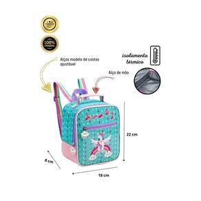 Confeccionada em Poliéster Isolamento térmico Alça de mão e de costas Design exclusivo Puxadores personalizados Fechamento em zíper Medidas aproximadas: Altura: 22 cm Largura: 18 cm Comprimento: 8 cm CUIDADOS: - Guarde em um local seco e arejado evitando locais úmidos. - Evite colocar excesso de peso no produto para não forçar os zíperes e costuras. - Proteja os objetos cortantes e/ou pontiagudos evitando o contato direto com o produto. - Evitar altas temperaturas. - Cores claras poderão manchar quando em contato com outros objetos ou roupas de cores pigmentadas.