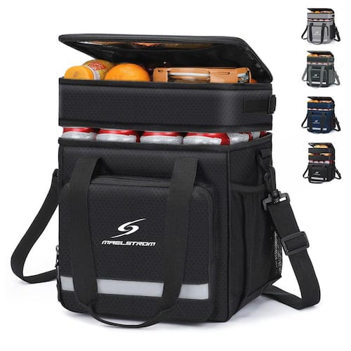 COMPARTIMENTO DUPLO — A lancheira Maelstrom é uma sacola isolada dobrável e expansível de dupla camada. Seu design de zíper duplo durável e fácil de puxar é livre de problemas. A estrutura esquelética especialmente projetada e o forro costurado nos quatro lados mantêm a lancheira em pé mesmo depois de ser dobrada por um longo tempo. É uma lancheira perfeita para trabalho, viagens de negócios e viagens diárias.