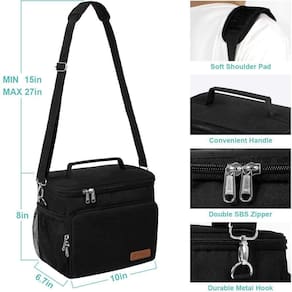 ? Bolsos espaçosos e numerosos: dois compartimentos principais para grandes quantidades de refeições, alimentos, bebidas e lanches durante todo o dia, dois bolsos laterais para garrafas de água e quatro bolsos extras para chaves, cartões e itens extras.