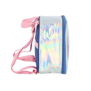 Características / Composição: - Material: 70% poliuretano e 30% PVC, com forro em 100% PVC para maior durabilidade - Compartimentos: 1 compartimento espaçoso com fechamento em zíper - Alças: Alça de costas ajustável e alça de mão para versatilidade no transporte - Cor: Prata holográfica com detalhes em azul - Zíper: Personalizado com puxador emborrachado para facilidade no manuseio
