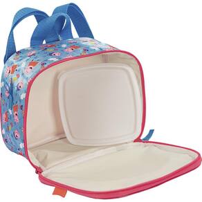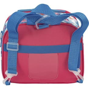 Lancheira escolar com tag identificador, acompanha potinho, alça carona, interior resistente a liquidos e etiquetas personalizadas.