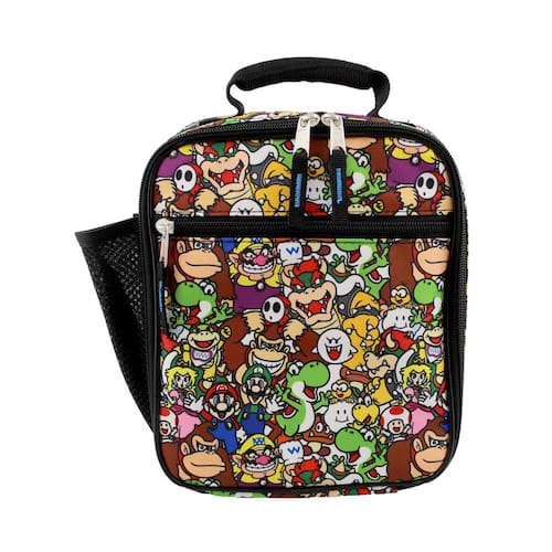 This Yankee Toy Box exclusive Super Mario soft lunch box is made from quality materials and is lightweight. Provides room to store sandwiches, drinks, snacks, and more! This Super Mario lunch box is well insulated to keep your child's food cold throughout the day. It is food-safe and PVC free, safe for your child's dietary needs. This Nintendo lunch bag features one large main zipped compartment, a small front zip Edição de Bolso for snacks, a side mesh Edição de Bolso, and a padded holding handle for easy carrying. The side mesh Edição de Bolso is made from durable athletic mesh and bag is reinforced with nylon for added strength. This awesome lunch bag is stitched with a durable nylon thread for extra durability. Features graphics of Nintendo Super Mario Bros. characters: Mario, Luigi, Princess Peach, Donkey Kong, Yoshi, Wario, Toad, Goomba, Boo, and more! - MAKE SCHOOL LUNCHES FUN - This Yankee Toy Box exclusive Super Mario soft lunch box is made from quality materials and is lightweight. Its shape allows for a lot of room for easy storage. The main compartment provides room to store sandwiches, drinks, snacks, and more! This lunch box measures approximately 9.5" X 8" X 3.5". Manufacturer suggested minimum age: 3 years +. - FOOD SAFE - This Super Mario lunch box is well insulated to keep your child's food cold throughout the day. It is food-safe and PVC free, safe for your child's dietary needs. It's the perfect lunch bag for any boy or girl! **Please note: Water bottle and other accessories are not included. - HIGH QUALITY & WELL CONSTRUCTED - This Nintendo lunch bag features one large main zipped compartment, a small front zip Edição de Bolso for snacks, a side mesh Edição de Bolso, and a padded holding handle for easy carrying. The side mesh Edição de Bolso is made from durable athletic mesh and bag is reinforced with nylon for added strength. This awesome lunch bag is stitched with a durable nylon thread for extra durability. - FEATURING THEIR FAVORITE CHARACTERS - This school lunch bag features colorful sublimated graphics of their favorite Nintendo Super Mario Bros. characters: Mario, Luigi, Princess Peach, Donkey Kong, Yoshi, Wario, Toad, Goomba, Boo, and more! It's the perfect addition to make every lunch a little more fun! - THE PERFECT GIFT! - Nintendo Super Mario Bros. lunch boxes make the perfect back-to-school, birthday, or Christmas gift. Why? They are well constructed, feature awesome images, and are very affordable. It's the perfect lunch bag for a day at camp, back to school, back to college, or for travel!
