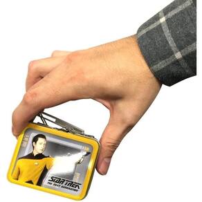 Ótimas para colecionadores, estas pequenas latas apresentam imagens fantásticas da série Star Trek: The Next Generation! Cada lata de aproximadamente 7,6 cm de largura x 5 cm de comprimento foi impressa em tela colorida para apresentar alguns dos seus personagens favoritos da série Star Trek: The Next Generation. Cada lata pequena vem completa com alça de plástico dobrável para transporte, além de dobradiça e trava para facilitar a abertura. Inclui uma (1) lancheira Teeny Tin aleatória. Há seis (6) designs no total para colecionar.