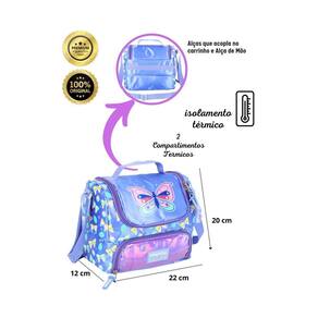 Lancheira Térmica: Confeccionada em Poliéster Isolamento térmico Alça de mão Alça que prende na mochila de rodinhas Design exclusivo Puxadores personalizados Fechamento em zíper Medidas aproximadas: Altura: 20 cm Largura: 12 cm Comprimento: 22 cm